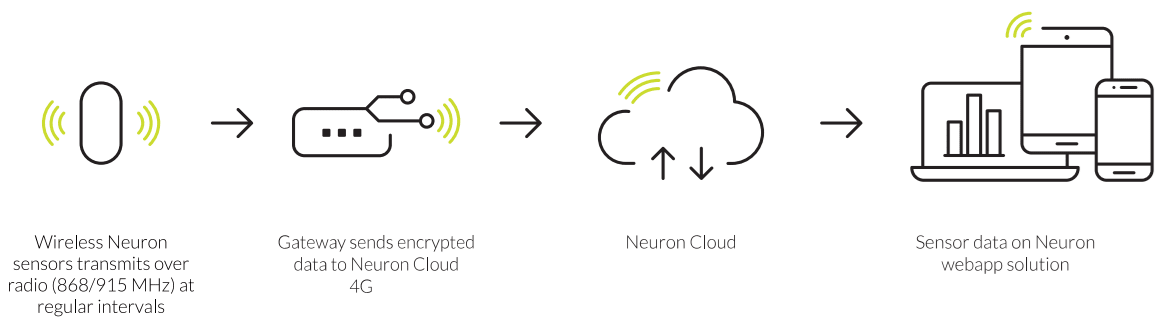 Neuron‑sensorene kommuniserer lokalt med Neuron Gateway. Denne enheten er bindeleddet mellom sensorene og skyen. Ved å kontrollere datatrafikken i begge retninger, samt bufre og forhåndsbehandle data, er gatewayen avgjørende for at Neuron‑systemet er enkelt og brukervennlig.